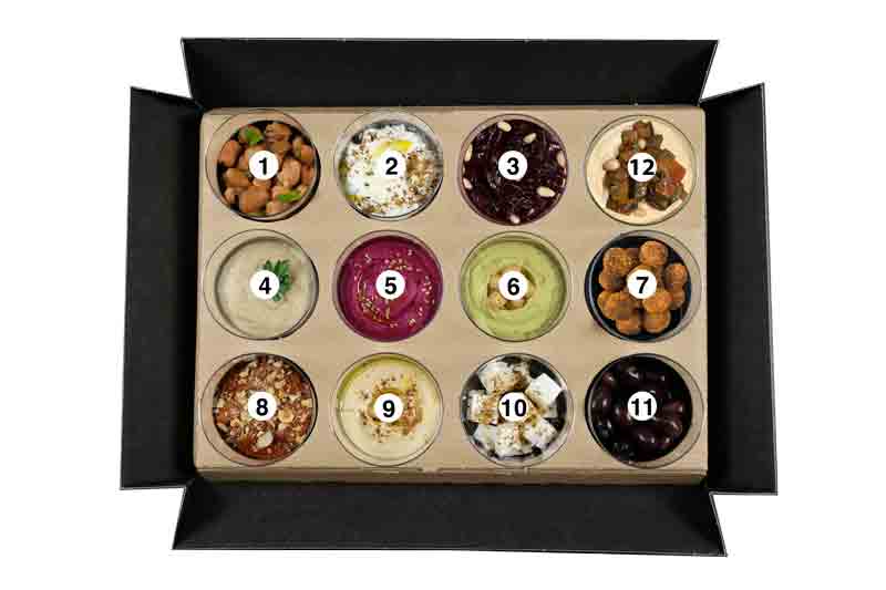 (1) FOUL MOUDAMMAS, (2) LABNE, (3) CIPOLLE CARAMELLATE, (4) MOUTABBAL, (5) HOMMOS BARBABIETOLA, (6) HOMMOS BEIRUTY (PREZZEMOLO), (7) FALAFEL, (8) MUHAMMARA, (9) HOMMOS, (10) CHANKLICHE, (11) OLIVE KALAMATA, (12) HOMMOS CON VERDURE.